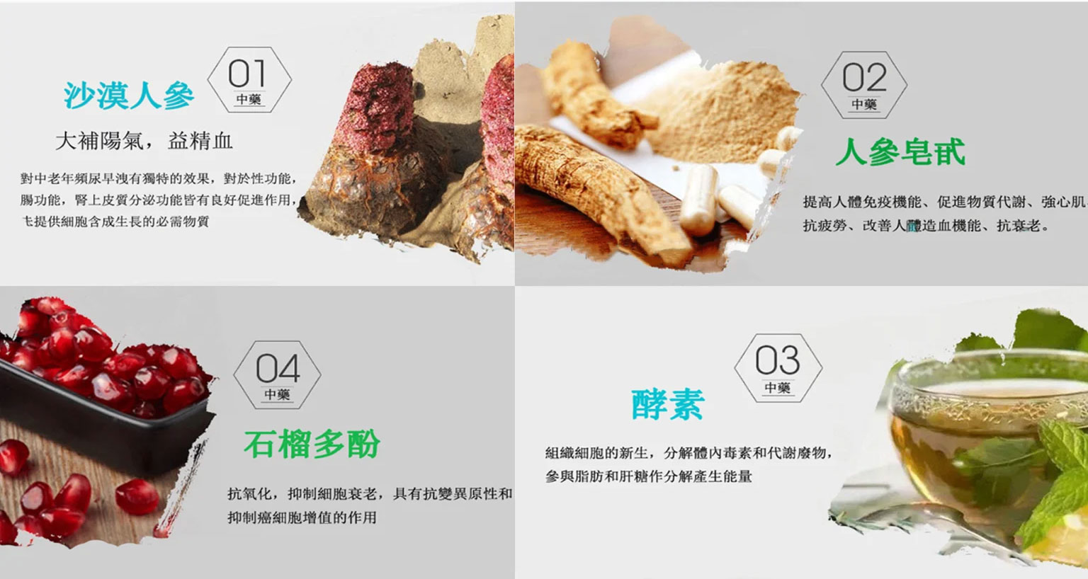 - 沙漠人參:沙漠人參具有大補陽氣、益精血的作用,對中老年人頻尿和早洩有獨特效果。它還能促進性功能、肝臟功能和腎上皮質分泌功能,並提供細胞生長所需的必需物質。