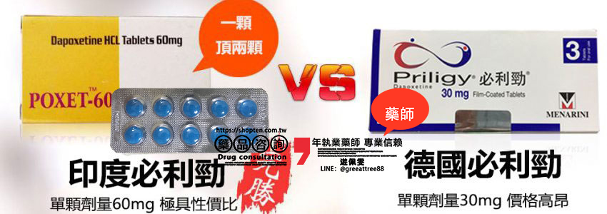 相較於原廠必利勁 Priligy,印度必利勁 Poxet-60 在價格與劑量選擇上都有明顯優勢,尤其適合預算有限或需長期服用的患者。