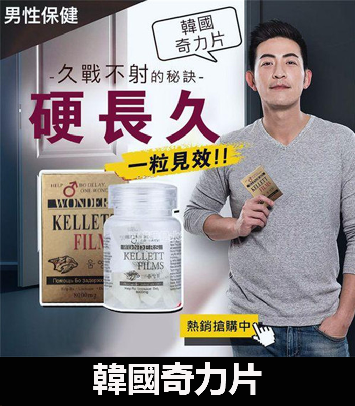 韓國奇力片也被稱之為日韓虎王,奇力片KELLETT FILMS采用純天然植物萃取,對男性性功能有著良好的調理作用;針對男性補腎生精,增大延時,增硬助勃,有著非常好的效果!基本上無副作用,上市以來,得到廣大男性的購買與好評;比較適合那些因腎虛引起的陽痿早洩,精力差,容易疲軟,勃起無力患者;對那些工作壓力大,心理負擔重而引起的性欲低下,勃起困難,硬度不夠和中途疲軟等性愛時間短的男性有顯著功效,在市面上有非常不錯的口碑!