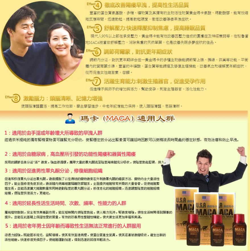MACA美國瑪卡專為改善男性性功能設計,對早洩、勃起不堅、堅而不久等問題有顯著效果。服用後15-30分鐘起效,藥效持續高達180小時,多次生效,無副作用。提升性愛時間十倍以上,幫助您創造更強勁的勃起力和射精力道,增強快感,實現“彪悍”人生!