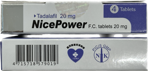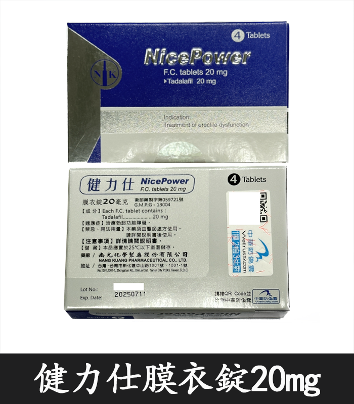 - 每盒含 4 錠 健力仕膜衣錠 NicePower 20mg,每錠含 20mg Tadalafil(犀利士成分)。